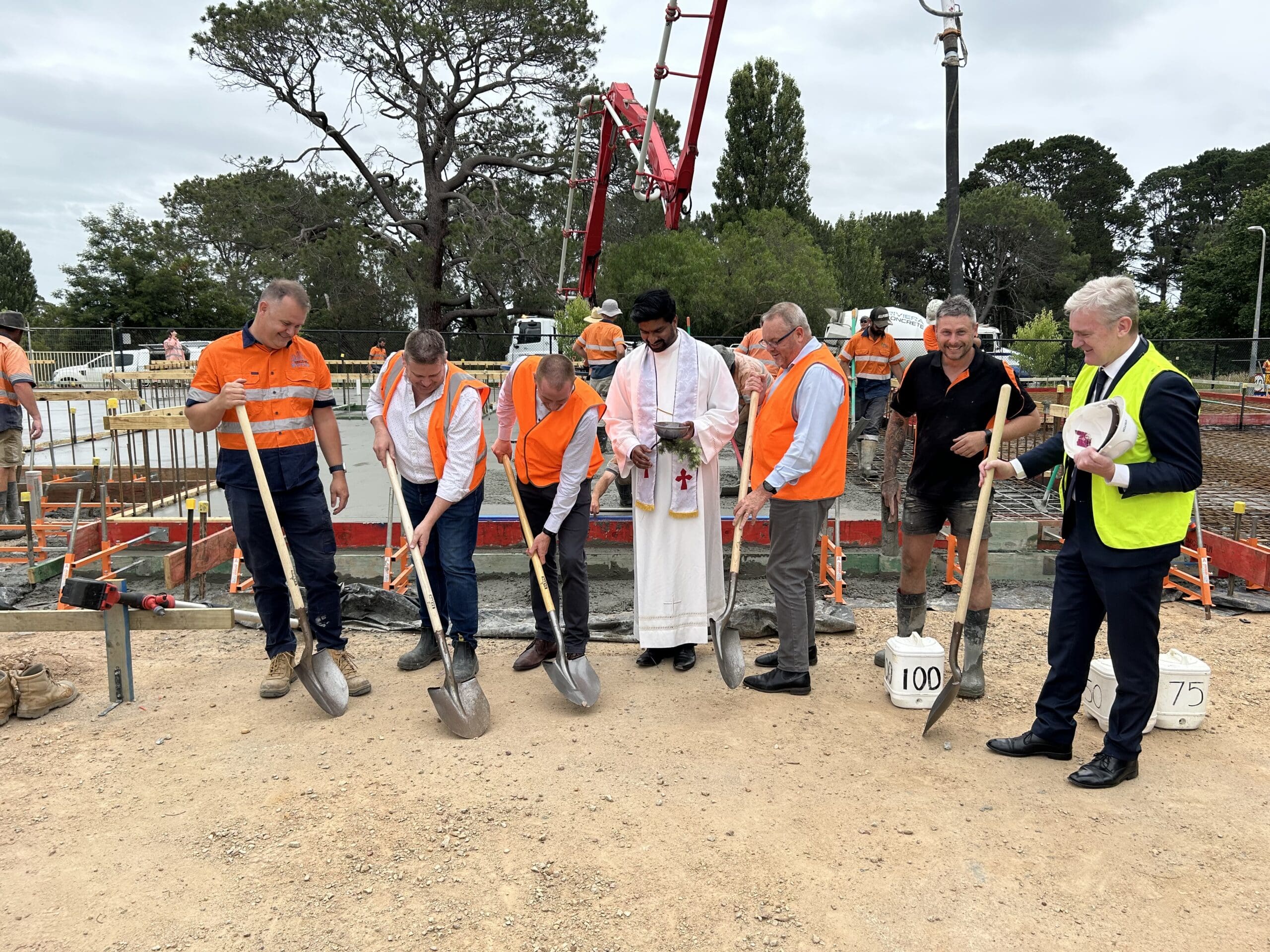 Featured Photo: Back row from left to right: Ben Frew – Eastern Victoria Construction Group (EVCG), Ms Gabbi Napolitano – Deputy Principal, Ingomar Matthes (EVCG), Joel Brayshaw – Principal), Mark Botteril – Crosier Scott Architects, Fr Aneesh George – Assistant Parish Priest, Carmel Boyd – School Advisory Committee/ Parish Representative, Dermot Cannon – Chief Planning and Infrastructure Officer, Diocese of Sale Catholic Education Limited (DOSCEL), Mick Maye – Manager Planning and Infrastructure Services (DOSCEL), Nick Hall – Former Principal. Front row from left: Isla Dorning- School Captain, Charlie Gartung – Vice School Captain, Dusty Pattison, Posy Reeves, and Aria Channing – Foundation students, Rose Lee – Chair Parish Pastoral Council, Jeanette Duggan – Former Principal, Tim Bull – Nationals Member for Gippsland East.